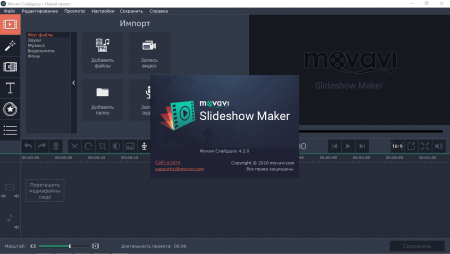 Не требуется (инсталлятор уже пролечен)Movavi Slideshow Maker – это простая и удобная программа для создания слайд-шоу. Вы сможете самостоятельно превращать фотографии из вашей коллекции в красивое видео, причем для этого вам не потребуется каких-либо специальных навыков. Загрузите изображения в программу, соедините фото анимированными переходами, добавьте подходящий саундтрек, наложите титры и эффекты и сохраните видео в нужный формат. Ваше музыкальное слайд-шоу готово!